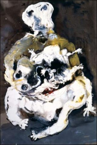 Dans la galerie du premier étage, la série des Implosions regroupe cinq toiles dont l’image de la femme s’offre à voir dans une trituration matiériste qui en dit long de la difficulté de la figurer. Il y va d’une mesure tragique et existentielle de l’être dans une mise à nu du corps qui n’est pas sans rappeler la série des Women de De Kooning ou celle des Dames de Dubuffet.