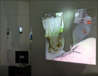 Installé au rez-de-chaussée, le laboratoire mobile de Quimera Rosa (littéralement la « chimère rose », monstre queer), duo franco-espagnol, se présente comme un espace de travail plutôt qu’un dispositif d’exposition. Sans indication, ni cartel, il dispose à vue documents de recherche, bac de culture biologique, kit de tatouage, échantillons de peaux tatouées ou de cellulose bactérienne. Le projet conçu pour « Entropia », travaillé à vue durant toute la durée de l’exposition, expérimente les moyens d’un devenir-plante des deux artistes. Sa proximité immédiate avec les œuvres d’A.O.O. [Art Orienté Objet] ne peut empêcher de penser à une de leur pièce-signature, Que le cheval vive en moi.