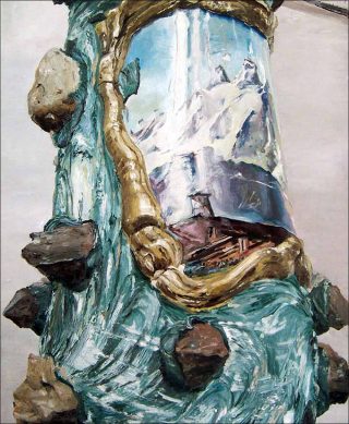 Le tableau intitulé Composition, réalisé à l’huile sur toile, est fondé sur une image-source, la photographie d’une poupée cassée, abandonnée dans un carton, et découverte au hasard d’une rue. Cette photographie a été imprimée en sépia, dans une première étape de mise à distance du sujet, avant de subir des taches d’eau, conséquences d’une fuite dans l’atelier de l’artiste. En reproduisant en peinture cette photographie, Mireille Blanc a conservé ces tâches qui ont réintroduit de la couleur dans l’image.