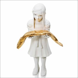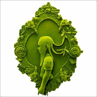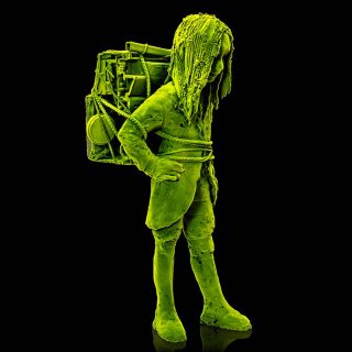 Moss People se traduit littéralement «Les gens de mousse». Les figurines réalisées par Kim Simonsson s’inscrivent dans un univers bien particulier, un conte de fées imaginé par le céramiste. Des enfants se retrouvent pris au piège dans une forêt. Mis à l’épreuve des éléments, certains se transforment en sculptures de glace tandis que les autres, recouverts par la mousse, deviennent partie intégrante du monde végétal. Réalisées en céramique émaillée et or, les fillettes créées par Kim Simonsson s’amusent innocemment dans la forêt, sautant à pieds joints dans les flaques ou chassant les oiseaux. Floquées de fibre nylon vert, les figurines masculines rappellent quant à elles le personnage de Peter Pan, roi du pays imaginaire.