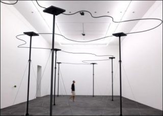 Philippe Ramette. Dans cette oeuvre, d’où le funambule est absent, c’est la matérialisation d’un parcours qui est en jeu. Le fil solidifié, en plus de matérialiser un signe graphique dans l’espace, suggère une forme de mise en danger. C’est une sorte de métaphore sur le refus de suivre un chemin droit et fixé par avance. Cela a à voir avec le déséquilibre, ou plutôt la recherche de l’équilibre. Les mâts matérialisent de manière symbolique des points d’arrêt pour le repos, l’hésitation, la réflexion, l’observation.