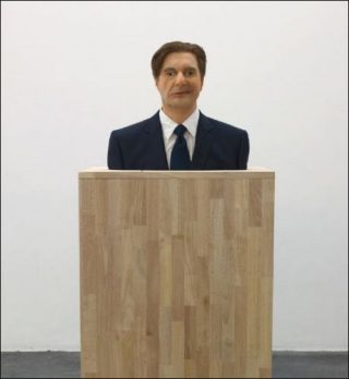 Sculpture pré-déboulonnable représente un personnage public, d’allure dictatoriale, dont les tibias sont prédécoupés par des encoches. La sculpture semble avoir été préparée pour être renversée plus tard. Le rapport de la sculpture au pouvoir vous intéresse-t-il?