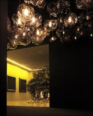 — Loris Gréaud, Spores 1, 2012. 35 unique pieces made of blown glass from the sand in an hourglass, System illuminated. 680 x 630 cm