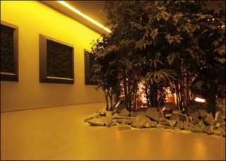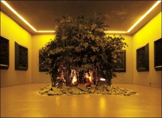 Au centre de la salle enfin, une «jungle domestique» composée de plantes artificielles frémit irrégulièrement, comme si un violent courant d’air la balayait, ou comme si un fauve, se déplaçant en son cœur, faisait tressaillir les branches en s’approchant vers nous, prêt à bondir. Dans ce monde à la croisée de l’organique et de l’artificiel, les vibrations faisant compulser les plantes sont en réalité dues à un signal électrique ayant enregistré les pensées de l’artiste lors de ses recherches. Et ce signal est ici réactivé et réutilisé pour alimenter un dispositif de vibreurs. L’installation vaut alors comme la traduction spatiale d’une pensée frémissante, prête à jaillir, tel un félin se concentrant patiemment puis se projetant sur sa proie.
