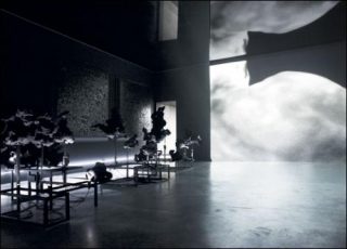 Nous pénétrons ainsi dans un espace tout à fait fascinant. Plongés d’emblée en pleine pénombre, notre perception et nos sens se trouvent perturbés. Tout à coup, la spatialité n’est plus la même. Nous nous trouvons dans le noir, des bruits étranges parviennent à nos oreilles comme des rumeurs inquiétantes. Au plafond, l’installation Spores présente des formes de verre soufflé, semblables à des méduses, clignotant d’un éclat jaunâtre. Dans cet univers nébuleux, nous découvrons deux écrans dont l’image symétrique décompose au ralenti le vol d’une chauve-souris, créature nocturne peuplant les contes et nourrissant les légendes de sa figure angoissante.