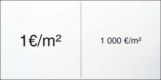 TheSquareMeter est une série de diptyques, dont le prix de vente au mètre carré est indiqué sur la toile. Le panneau de gauche, accessible à tous, est symboliquement marqué 1 €/m2, tandis que celui de droite suit la courbe économique, grimpe de centaines en milliers et se déplace du premier marché au second au gré des spéculations, de la côte, de la rareté, de toutes ces stratégies qui font monter la valeur d’une œuvre; ouvrant ainsi la voie à des marchés annexes piqués par l’excitation des enchères et atteignant des sommes toujours plus exorbitantes.
