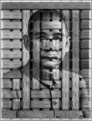 Dans la première salle, avec la série chinoise (2005), c’est toutefois un autre procédé qui est à l’œuvre. Des entrelacs de carton gris (dont le même type de formes composeront un livre en bois de quatre pages) forment ici un idéogramme chinois qui entre en relation avec la sérigraphie d’une photographie.
