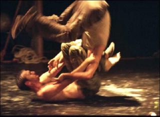 Des rapports de forces pervers s’instaurent: la soumission, l’inertie, l’immobilité qui caractérisent les contacts avec les hommes en noir semblent générer de l’agressivité, de la violence, des décharges de furie envers ceux qui partagent la même condition. On atteint un régime de réalité qui rappelle la formule de Hobbes « homo hominis lupus ». L’animalité suinte, nous sommes témoins d’une descente vers les instincts les plus primaires: les danseurs incarnent par moments des chevaux sauvages ou des chiens qui aboient sous la lune. La folie meurtrière éclate dans un long moment épuisant, où ils essaient de se noyer les uns les autres.