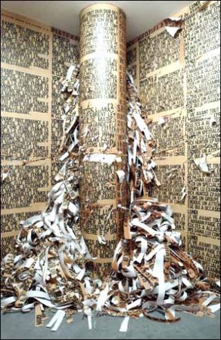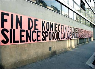 L’artiste Jadwiga Sawicka travaille cette distance entre une culture locale et la culture importée dans ses affiches déchirées qui mêlent le texte à l’image. Du sol au plafond des bandes superposées déclinent des textes de séries télévisées en polonais et en français. Elles sont déchirées de sorte que l’une fasse apparaître l’autre. À deux endroits, des lambeaux d’affichent font s’entrecroiser deux écritures, celle des mass média et celle du quotidien : voix de l’image et voix de l’usage.