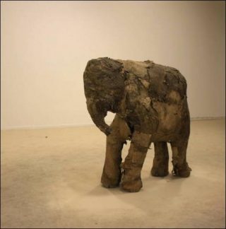 Laurent Le Deunff. Je travaille généralement avec ce que je trouve près de chez moi, c’est le cas pour mes sculptures en bois et pour la sculpture Mammouth, qui est fabriquée avec du carton d’emballage, récupéré après la fonte des neiges à la fin de l’hiver.