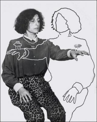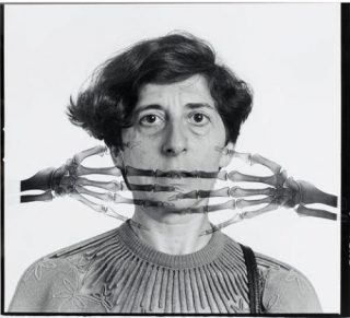 Au politique se mêle donc une réflexion sur notre identité et la condition humaine. Des mains de squelette masquent le visage d’Esther Ferrer, laissant planer l’ombre de la grande faucheuse sur ses traits. Memento mori: on n’échappera pas à notre mortelle condition (L’Artiste et la Mort). Esther Ferrer intitule une de ses œuvres Autoportrait en chantier ou lacère son image de coups de cutter: avons-nous ainsi une identité fixe, définie une fois pour toute? Ou est-elle altérée par le temps et condamnée à porter ses stigmates, ses blessures, ses cicatrices?