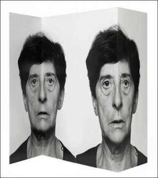 Pour rendre encore visible le travail du temps, Esther Ferrer choisit sept autoportraits qu’elle découpe en deux et recompose en mélangeant aléatoirement les moitiés. Les autoportraits reconstitués marquent donc une dissymétrie entre leurs deux parties, dissymétrie qui s’accentue d’ailleurs à mesure que l’écart temporel augmente entre les deux parties accolées. Plus le temps passe, plus la chevelure se raccourcit, plus les rides au-dessus de la bouche s’accentuent, plus la peau du cou et du menton tombe. Chaque autoportrait apparaît ainsi comme une combinatoire, un puzzle tentant de cerner et de pointer l’essence de son modèle et les corruptions que le temps lui inflige.