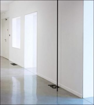 Après avoir ouvert et fermé plusieurs tiroirs, observé les lignes verticales et horizontales des sculptures minimales qui glissent entre elles au fil de nos pas, regardé des vidéos de bâtiments administratifs vides et de parkings, on se rend compte que l’absence humaine dans les images va de paire avec un environnement urbain qui impose un déplacement continu entre lignes droites, surfaces lisses, reflets.