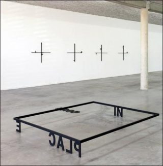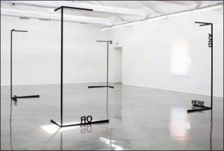 Dans le jardin du Musée régional d’art contemporain de Sérignan, Peter Downswbrough a installé parmi les arbres, les voitures, les gens qui passent et les bâtiments alentour, deux tubes métalliques qui soutiennent le mot «Et». Cette œuvre au premier abord énigmatique s’éclaire au cours de la visite de l’exposition où l’on suit les façons dont l’artiste divise l’espace urbain entre des lignes verticales et horizontales qui glissent les unes sur les autres en fonction de notre propre déplacement.
