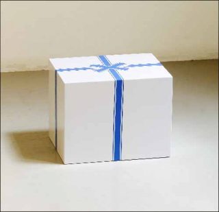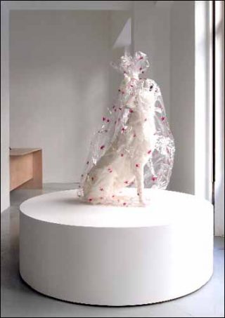 Toute l’exposition explore les paradoxes de l’image de pureté qu’on nous donne quotidiennement à voir. En vitrine de la galerie, un loup hurle à la lune dans un emballage en papier transparent constellé d’étoiles. L’animal en fourrure de chèvre respecte parfaitement les proportions du loup. La douce peluche blanche enveloppée de papier cadeau se mue en monstre hybride. Présentée sur un socle motorisé, la bête sauvage tourne sans cesse sur elle-même, prisonnière sacrifiée sur l’autel de la consommation. Son titre menaçant Wolf ! (Au loup !) lance un cri de détresse…