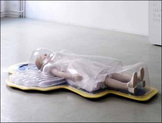 Au premier étage de la galerie, une poupée de la taille d’une fillette en robe de communiante repose allongée sur le sol. Le mannequin baptisé Infinite Justice est présenté dans un emballage de plastique thermoformé avec deux ailes déployées. Le jouet grandeur nature, momifié dans sa boîte, ressemble à un gisant. Le malaise provoqué par l’image de la fillette morte est récupéré de manière mystique. Deux stèles blanches sur lesquelles sont gravées des messages de transcendance encadrent l’ange inerte. Ces Epiphanies en matière synthétique imitent le marbre. Elles reprennent le discours radical de certaines sectes.