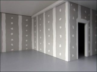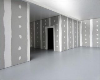 Marion Robin construit un lieu en construction. À l’échelle 1: elle peint sur les murs de la galerie des pans gris recouverts alternativement de lignes blanches verticales et horizontales et de lignes de points blancs qui les scandent. Motif placoplâtre. Elle prépare le lieu, installe les scotchs, dessine le pourtour des portes. Tout est en place. L’espace est prêt pour sa préparation. Un lieu en devenir qui n’aura jamais lieu. Ici, il n’est nullement question de maquette mais d’une exposition qu’elle investit entièrement par un geste qui trace une image et pose une situation. Cinq vues présentent la totalité d’un lieu suivant un principe de rotation. Pour que chaque coin, chaque recoin soit bien visible.