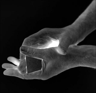 Le sous-sol de la galerie, relativement lugubre, nous plonge dans une sorte de crypte archéologique où l’on rencontre justement un ensemble de photographies, de vases et de moulages. Etonnamment, la lumière ne provient pas des éclairages de la galerie ou des cimaises, mais elle émane des œuvres elles-mêmes. Par exemple, Geometria nelle mani présente une quinzaine de photos en négatif, où Penone pétrit dans ses paumes des modules géométriques.