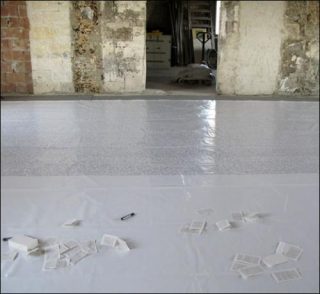 Cette année, Jean-Christophe Norman est passé à son tour par ces lieux. Il y a transcrit, sur trois grandes bâches, une grande partie du livre Ulysse de James Joyce (dans la traduction française coordonnée par Jacques Aubert). C’est après l’avoir déjà copié à la main sur 353 feuilles de format A4, qu’il a décidé de l’écrire de nouveau intégralement, mais cette fois à même les surfaces du monde (chaussées, murs et parois…), et au fil de ses voyages.