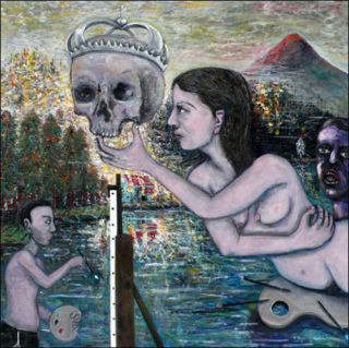 Dans ces vanités d’un nouveau genre, crânes, horloges, clowns rieurs, ruines modernistes et chiens philosophes sont là pour nous rappeler que l’existence est brève; mais leur présence est sans cesse contrebalancée par des mythes intemporels, tels Œdipe et le Sphinx ou Narcisse et Echo qui rejouent éternellement leur rôle au bord d’un étang aux eaux envoûtantes, entouré de forêts.