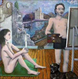 Dans une grande toile aux espaces enchâssés, le peintre au corps frêle porte un gant de boxe rouge, exhibant sa maladresse, un combat avec la gaucherie, son incompréhension face à ce qu’il a face à lui, cherchant la bonne distance: sa main invalidée tient le pinceau avec difficultés et aimerait bien peindre à même le corps nu d’une femme, comme surgi de la toile restée vierge sur laquelle celle-ci trône ironiquement. Elle seule nous regarde, belle gardienne de la lumière, symbolisée par une bougie, omniprésent clin d’œil à Georges de La Tour.