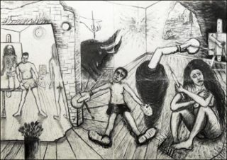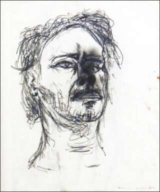 Ses dessins, qu’il n’avait jusqu’ici jamais exposés, livrent sans retenue le côté sombre du peintre. Ils dégagent une noirceur crépusculaire qui, dans l’immédiateté du trait jeté sur le papier, traduit un cri, une boule d’angoisse. Au fusain ou à la mine de plomb, la ligne est brisée, saccadée, les zones d’ombre sont d’un noir épais. Ce langage accentue la nature expressionniste de sa pratique. Deux autoportraits sont d’une cruelle beauté, de celle qui vous prend aux tripes, qui vous parle d’un homme esseulé, dans la vérité crue des masques tombés.