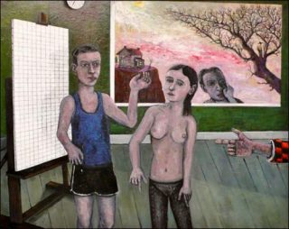 Ses tableaux sont construits comme de véritables espaces théâtraux où il rejoue la scène de l’homme peignant le corps nu de son modèle féminin. Mais ce qui frappe, c’est la distance entre ces deux êtres. Si la jeune femme s’offre nue à tous les regards, elle échappe pourtant au peintre comme au spectateur. Expression absente, peau à la teinte rose homogène, regard fixe tourné dans le dedans, cette femme qui tient un cierge entre les mains, symbole de vie et de connaissance, reste définitivement perdue dans ses pensées.
