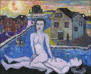 Dans la toile Ton coeur a la forme du gant de boxe avec lequel je peins tous tes contours, il s’en empare, dans un geste prométhéen, pour la faire apparaître, hors de la toile blanche, mi modèle, mi créature formée par le pinceau. Mais le sujet féminin semble éternellement ailleurs. Son double s’éloigne dans le fond de la composition, dos à nous mais face au mur ouvert sur un paysage de ville détruite. A l’avant plan de cette trouée vers le dehors, une barque file sur l’eau, évoquant la célèbre embarcation du tableau d’Arnold Böcklin et son dernier voyage vers l’Ile des morts.