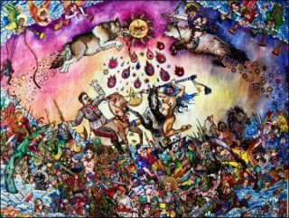 Les personnages figurés appartiennent tant aux mythes et cultures anciens qu’à l’actualité du XXI siècle. Figurent ainsi plusieurs personnages bien connus dans le dessin Le Jugement Dernier: «Anubis, dieu funéraire de l’Égypte antique; saint Michel, représenté avec la balance du Jugement dernier; saint Pierre taquinant une âme avec la clé du Paradis; Mickael Jackson en mort vivant tout droit sorti du clip Thriller; Cerbère, le chien gardant l’entrée des Enfers; Satan sous les traits d’un personnage de South Park, etc. Le casting, hétéroclite, dévoile à lui seul l’histoire: le spectateur découvre une vision très personnelle et peu conventionnelle du Jugement dernier.»