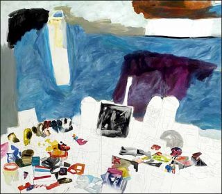 Dans le détail, l’artiste ne mêle jamais son fond et ses formes. Mieux, elle laisse des zones sans peinture, le fond justement qui dans la plupart des cas n’est jamais recouvert et des objets, ici de multiples détritus qui vivent simplement par le trait du dessin préparatoire. Un goût d’inachèvement là aussi qui favorise l’éclat de la peinture et surtout la beauté de l’objet (peint ou non) dans sa défaite ou disons, dans sa lente agonie.