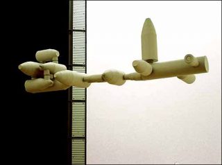 Une réalité transfigurée par la peinture chez Vitorelli. Une réalité plus embarrassée, une rappropriation moins enjouée mais tout aussi poétique chez Andreas Zybach. Le jeune allemand accroche des photographies représentant quinze vaisseaux, réacteurs ou containers spatiaux fabriqués par les scientifiques du monde entier. Des joyaux du progrès universel qui, depuis les premières conquêtes de l’espace, nourrissent l’imaginaire de chacun. Zybach les reprend et les combine dans une sculpture planante, sorte de station Mir empruntée, étrange et absurde à la fois. Le décalage de l’échelle (l’une des spécialités de Zybach) s’amuse du mythe mais celui-ci perdure pourtant dans son positivisme un peu béat.
