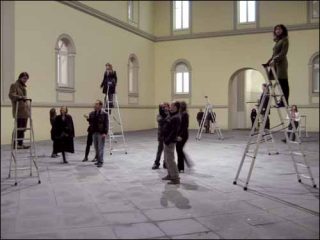 — Climb at your own risk, 2006, 10 stepladder, engraved text. Vue d’exposition MADRE, Napoli, 2007. Dimension variable.