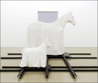 Résistant au discours simplificateur autant qu’à l’enfermement des formes, Guillaume Leblon élabore un nouveau paysage de sculpteur qui privilégie un rapport poétique à l’espace et au monde — une relation active, mobile, ouverte, où les questions du temps, de l’absence, de la mémoire, sont renouvelées par les œuvres récentes de l’artiste, non pas tant inscrites dans le registre du geste, comme les œuvres antérieures, qu’issues d’opérations de collages d’éléments; une nouvelle famille d’œuvres où surgissent parfois les figures humaines et animales.