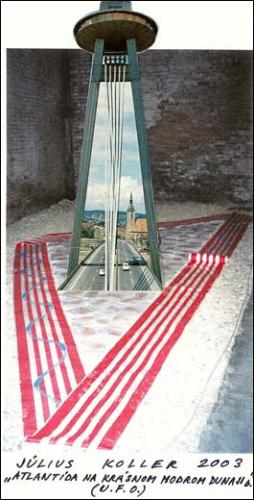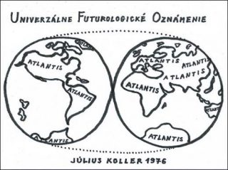 Un ensemble de dessins, collages, cartes, photographies et documents présentés dans l’exposition montre les différentes associations imaginées par l’artiste: parfois Julius Koller est au centre de la relation entre les ovnis et l’Atlantide, parfois il se sert d’un triangle diabolique pour critiquer le système entre Art et Pouvoir dans son pays. Ailleurs l’Atlantide prend une dimension plus géopolitique avec certaines allusions à l’impérialisme mondial. Mais souvent Atlantide produit une réflexion plus existentielle sur l’origine du monde et de notre conscience, terre d’humanité.