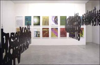 Une lecture franche, livrée sans fard, sans volonté d’imprimer une quelconque démonstration. Les mots simples et directs des affiches percutent un graphisme conquérant perché sur des tons très contrastés: des jaunes et des verts qui affrontent une typographie noire ; des volutes agencées dans des couleurs diaphanes en opposition à une écriture raide, sans véritable sensualité. Ils affichent même leur prolifération frôlant la saturation complète dans l’installation du centre. Jusqu’à s’effacer pour ne devenir qu’une séquence dans le rythme d’un tag sans révérence.
