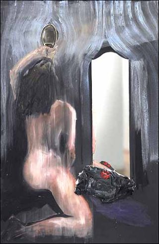 — Le Voyeur, 2005. Huile, miroir, photographie sur toile. 195 x 130 cm.