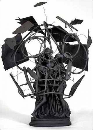 La prise en compte du corps du regardeur se prolonge dans une série de sculptures noires, sombres, qui s’apparentent, par une accumulation d’objets divers, de jouets, d’ordinateurs, de PlayStation ou de poêles, à de véritables ex-voto. Leur structure laisse une place importante au vide et dessine des visages de mort, des évocations funestes, des sentiments de crainte et des relents de guerres. Véritables Vanités, elles suggèrent les errances du monde contemporain et les peurs de l’artiste.
