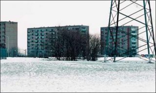 La caméra enregistre l’architecture périurbaine à Halle-Silberhöhe, en Allemagne de l’Est, des immeubles préfabriqués, désertés et voués à la démolition.