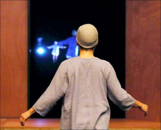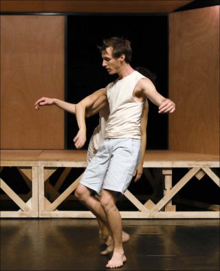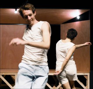 La scène n’est qu’une boîte de bois, ouverte d’un côté, avec quelques ampoules jouant des ombres et des lumières, et un écran où les images se disloquent en reflets cassés. Ce n’est d’ailleurs qu’un point de départ ou un refuge, un espace de jeu : les danseurs en sortent, pour s’approcher du public, parfois l’inviter à les rejoindre.