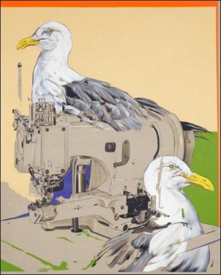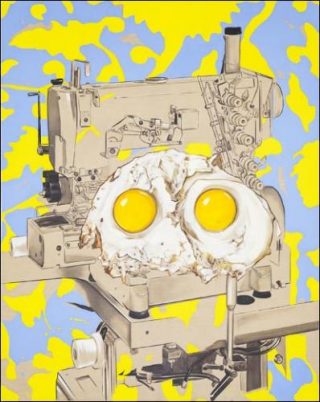 C’est à Los Angeles, à l’ombre d’écrans bien plus larges qu’il a étalonné ses peintures récentes. Pourtant, aucun effet en «rama» ou de débordement camp n’émane de la fréquentation intime de la capitale californienne — un séjour qui pour cet admirateur avoué de John Waters, aurait pu avoir valeur de grand tour. C’est dans la banlieue de celle-ci, dans la dilution de l’imagerie pornographique à travers l’imaginaire si «next door» que la marque American Apparel déploie dans la ville de son siège, qu’il a d’abord trouvé à assouvir sa collectionnite visuelle. Il est ensuite remonté jusqu’à une usine de la marque. Dans ses ateliers «sans sueur» (sweatshop free) qui font la fierté de la marque, Armand Jalut cherchait peut-être l’incarnation des corps naturels jusqu’au détail qui font le succès des publicités American Apparel. Il en est ressorti avec des modèles mécaniques, et des références industrielles de machines à coudre en attente de rencontre.