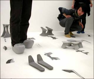 Un trouble est créé, dû au fait que les objets vont au-delà de leur usage premier et fonctionnent comme des révélateurs de sens. Dans Nowhere (2004) de Robert Stadler « A quoi ça sert » se pose d’emblée. L’objet devient porteur d’un message, il suscite un nouveau genre de démarche et de comportement. Les chaussures de Marie-Ange Guilleminot incitent à un nouveau type de déplacement, hésitant, différent, afin de déclencher une réflexion sur l’être humain, sur ses habitudes, son quotidien.