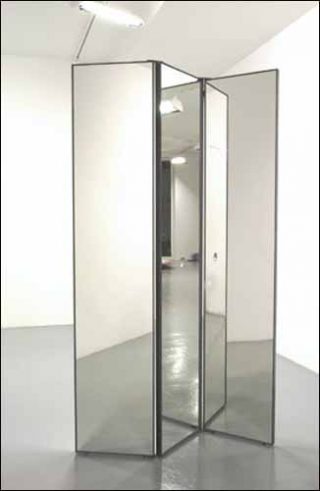 — Sans titre, (Paravent je suis civilisé(e)), 2004. Paravent à trois ventaux miroir, acier, bois. 185 x 116 x 3 cm.