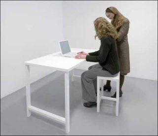 — Marie-Ange Guilleminot présente Absalon cellules, 1993, 2004. Ordinateur portable, 6 CD Rom, bureau, tabouret. Bureau de la cellule n°1 : 140 x 70 x 80 cm, tabouret de la cellule n° 1 : 55 x 40 x 29,5 cm.