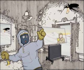 A Melted for a Cold Mirage complexifie la dialectique en proposant un curieux jeu de dédoublements et de reflets, un “mirage”. Un des personnages pointe son doigt vers un étrange insecte volant, tandis qu’un autre qui lui ressemble beaucoup fait le même geste dans ce qui pourrait être à la fois un miroir et un écran, vers un insecte similaire derrière une vitre — ou, là encore on hésite, un écran, voire même un miroir.