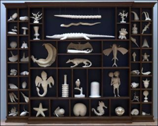 — Mark Dion, The Phantom Museum, 2010. Cabinet de curiosité et divers objets en argile et papier maché (racine, coquillages, coraux, minéraux, reptiles, monstres naturels et chimères). L 218 cm x p 35 cm x h 218 cm