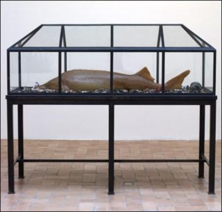 Que dire ainsi du discours greenpeacien qu’impose la vue d’un esturgeon en résine sur son lit de verroteries, sous sa chape de verre en forme de cercueil (The Sturgeon, 2010)? Eh bien que si l’on pouvait s’émouvoir de voir disparaître les esturgeons pour des motifs autres que l’angoissante perspective d’une pénurie de caviar, il suffit de voir ici une reproduction fidèle de ce poisson pour perdre d’un coup tous ses scrupules. Cette grosse chose gratte-vase des bas-fonds de la Garonne est en effet parfaitement hideuse. Et l’on ne peut que s’interroger: comment peut-elle produire de si délicieux grains noirs ?