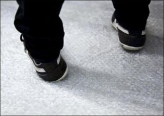 Avec Horizontal Orientation, le papier bulles (souvent utilisé pour le transport des Å“uvres) recouvre complètement le sol de l’espace d’exposition, ce qui nous laisse imaginer que le lieu est en train d’être rénové, ou que le sol est protégé avant d’être recouvert d’un autre matériau. Néanmoins, l’artiste ne s’intéresse pas aux utilisations traditionnelles de ce matériau, mais souhaite en activer les qualités physiques. Lorsque qu’il s’étend sur le plancher de l’espace que nous souhaitons pénétrer, nous nous trouvons engagés dans une sorte de participation inévitable. Nous ne pouvons éviter de faire du bruit en le foulant. Il indique notre présence et laisse une trace audible de nos mouvements.