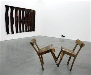 Adepte de la construction de machines et de mécanisme très «low tech», Ariel Schlesinger semble plus proche du bricolage que de l’impeccable machinerie. Avec sa pièce Act Without, une poésie du «rien» semble se mettre en branle à travers la simplicité du mécanisme. Dans une curieuse chorégraphie en trois actes, les deux chaises qui constituent l’œuvre se meuvent grâce à une discrète motorisation. Un aspect très humain émerge de l’irrégularité de ces modèles imparfaits qui chutent inlassablement.