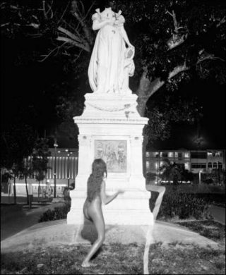 Moyen terme entre une sculpture vivante et un corps en action, sa figure nue n’est pas à interpréter dans le sens d’un combat, par exemple féministe, ou de la dénonciation de processus biopolitiques. Sarah Trouche se pose d’ailleurs moins comme un médium abstrait et anonyme, un corps-surface ou totem, que comme un Autre concret, un corps frontalement exposé, agissant et cherchant à signifier, qui interpelle le public en le délogeant du confort des a priori culturels. Son corps en guise de signe, elle érige des sculptures éphémères qui incitent à un nouveau regard sur ces peuples en marge que l’époque a comme réduits au silence, ici les martiniquais engagés dans la réhabilitation sans fard du souvenir colonial. Sarah Trouche travaille enfin à faire émerger des angoisses liées à la globalisation, en l’occurrence les oublis de la mémoire collective, en poétisant le travail de lanceur d’alerte. Elle devient alors cette Autre sentinelle, empathique et engagée qui transforme la pratique performative en politique des inconscients culturels.