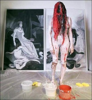 Au-delà du contenu narratif, ce combat entre Sarah Trouche et ses propres tableaux fait écho à une problématique artistique, autant personnelle que théorique: l’opposition, réelle ou supposée, entre les arts vivants et plastiques. Ici, la joie prise à la destruction signe un retour à la primauté de l’acte sur la représentation, donnant au défoulement pulsionnel la force d’une affirmation, d’une revendication à l’art performatif. Les œuvres plastiques ne sont pas simplement ajoutées au décor mais bien absorbées par la performance, puis détruites, soumises aux aléas de l’action et aux modalités de l’éphémère. Sa position est toutefois plus ambiguë qu’il n’y paraît car Sarah Trouche ne sacrifie pas totalement le mécanisme de séduction formel en reléguant les œuvres picturales au rang de déchets. Ces peintures, qu’elle a elle-même exécutées, participent avant tout à la présentation plastique de ses actions et lui fournissent un cadre formel attractif. Plus encore, en se faisant le support pictural de son geste violent, elles permettent à Sarah Trouche de s’extraire de la référence classique — la peinture d’histoire — pour embrasser les formes de la modernité et indiquer ainsi le sens d’un dépassement des codes d’appréciation du XIXe, une nouvelle évaluation des normes esthétiques et culturelles. Après avoir longtemps privilégié la forme monochromatique, elle semble pour l’occasion s’en émanciper: les éclaboussures, jets, coulures, gouttes et amas de matière se réfèrent davantage à l‘action painting, à la technique de l’all-over (dripping, pouring), traduisant en acte une nervosité d’exécution qui renvoie sans nul doute à la colère motrice de sa pièce.